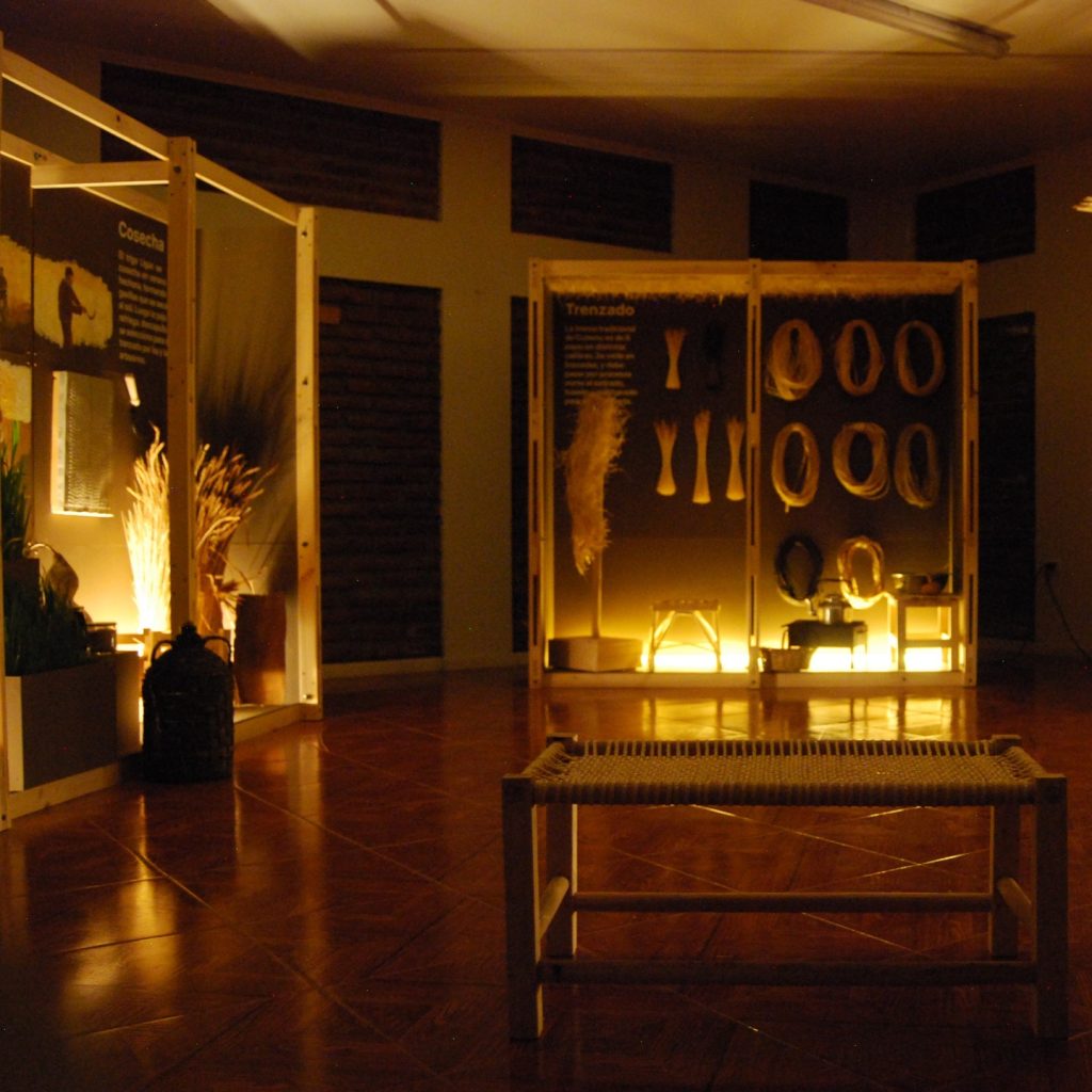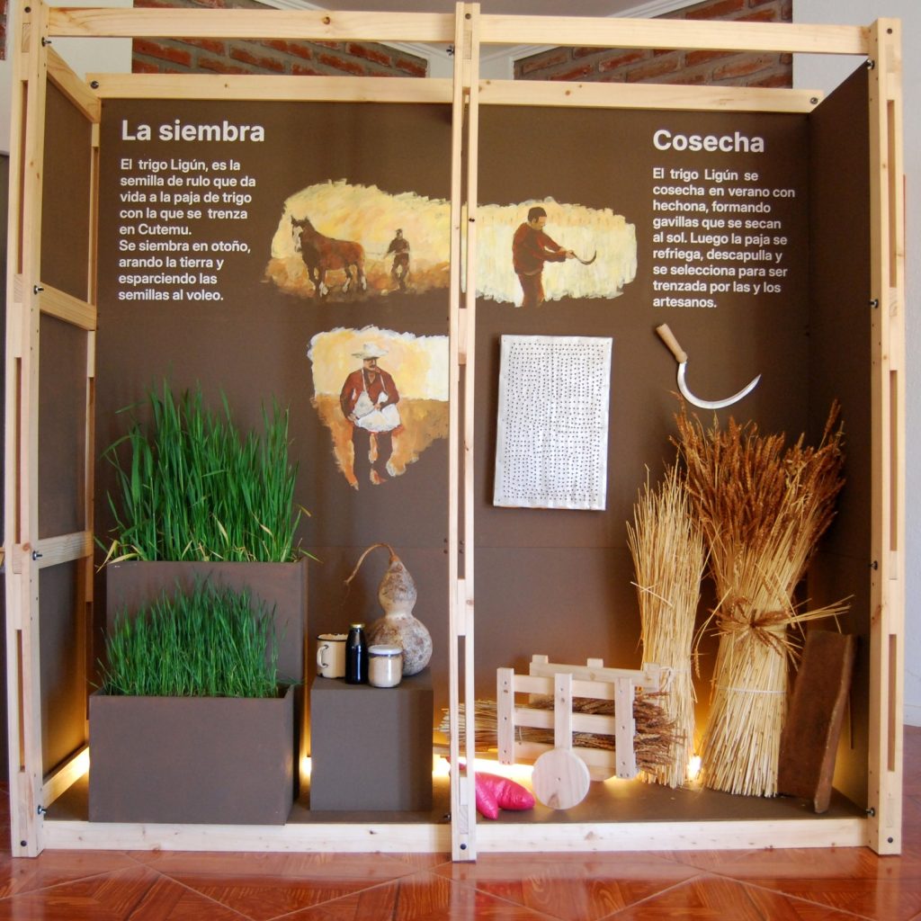 La exposición se compone de 3 módulos que expresan distintas etapas y procesos de la artesanía en paja de trigo Ligún: La siembra, cosecha, el trenzado y la artesanía.