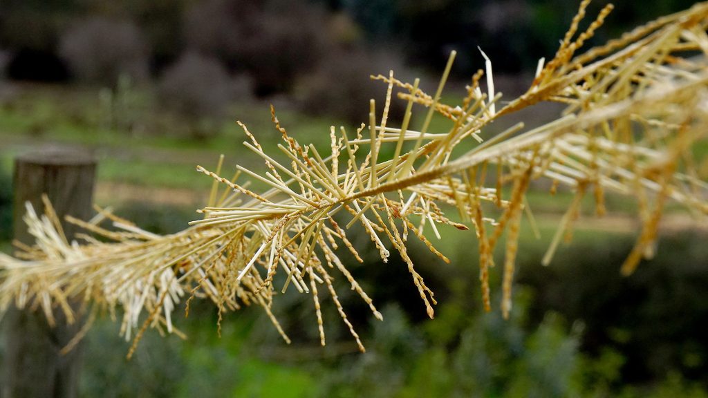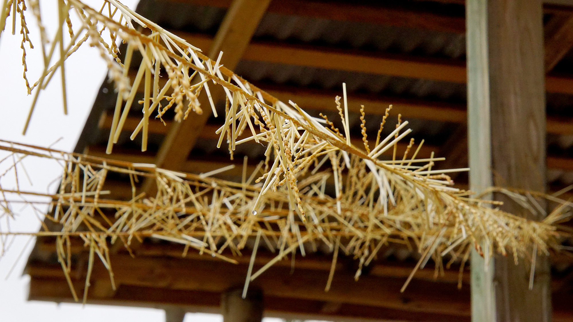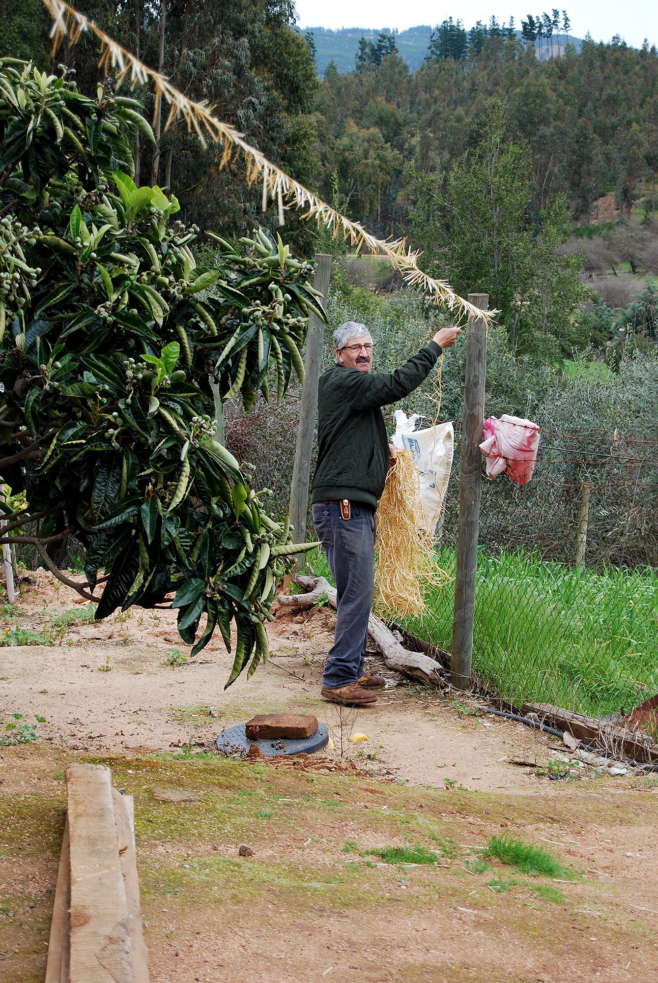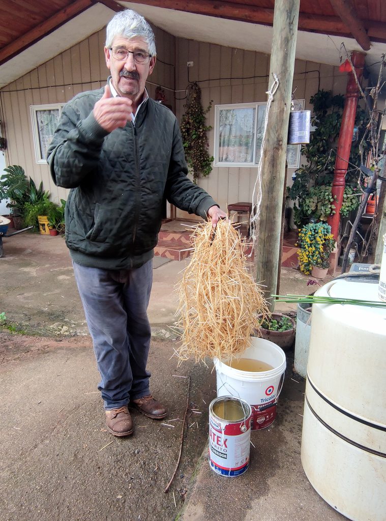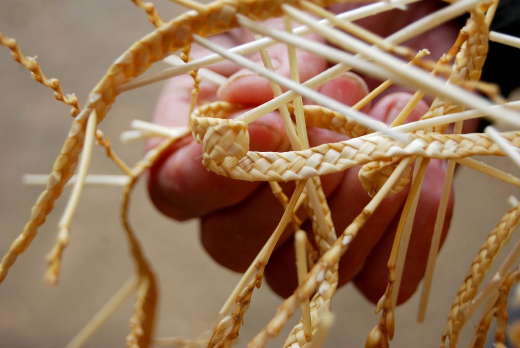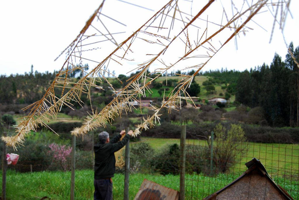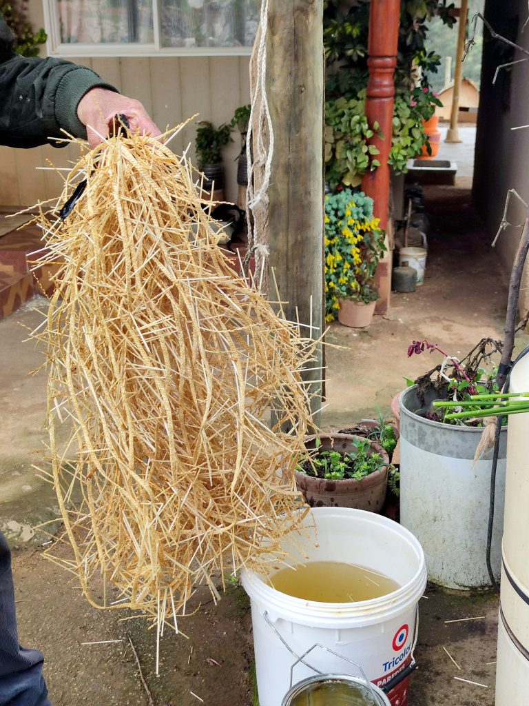 Antes de tusar la trenza (cortar los extremos de las pajas), es necesario estirarla, proceso que no habíamos visto. Primero se moja, y luego se estira entre postes o similares.
