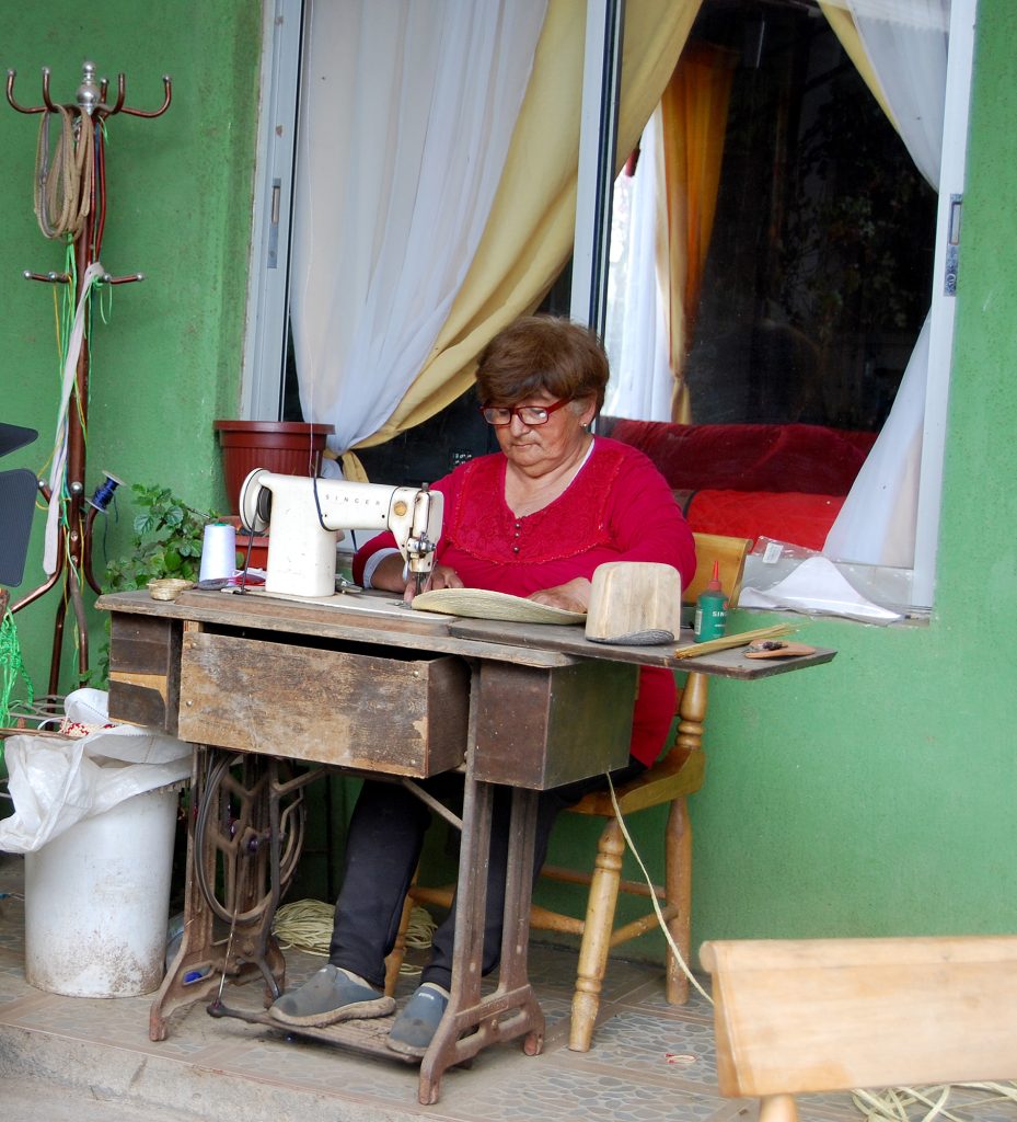 Costura: “A principios del siglo XX las cuelchas y chupallas eran confeccionadas completamente a mano por mujeres de la zona (Valle del Itata)” (Silva, 2018). Éstas se cosían a mano utilizando hilo de algodón extraído de los sacos de harina, los cuales se cubrían con cera de abeja. La costura se realizaba con una aguja grande y gruesa, comenzando por la copa y terminando en el ala del sombrero. Con el tiempo, se incorporaron máquinas de coser manuales y de pedal para agilizar el proceso. Muchas de estas máquinas fueron modernizadas con la adición de un pequeño motor eléctrico.