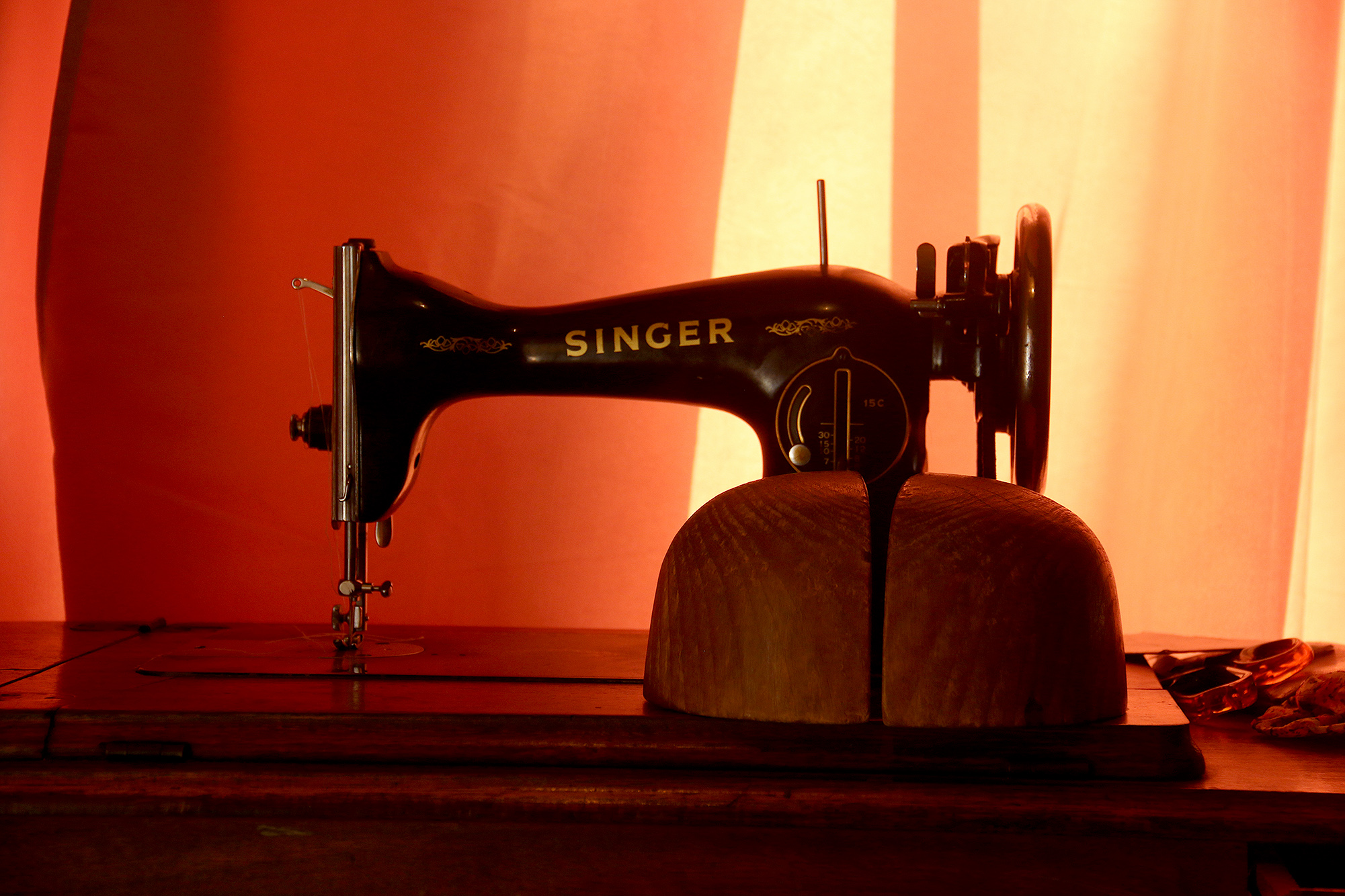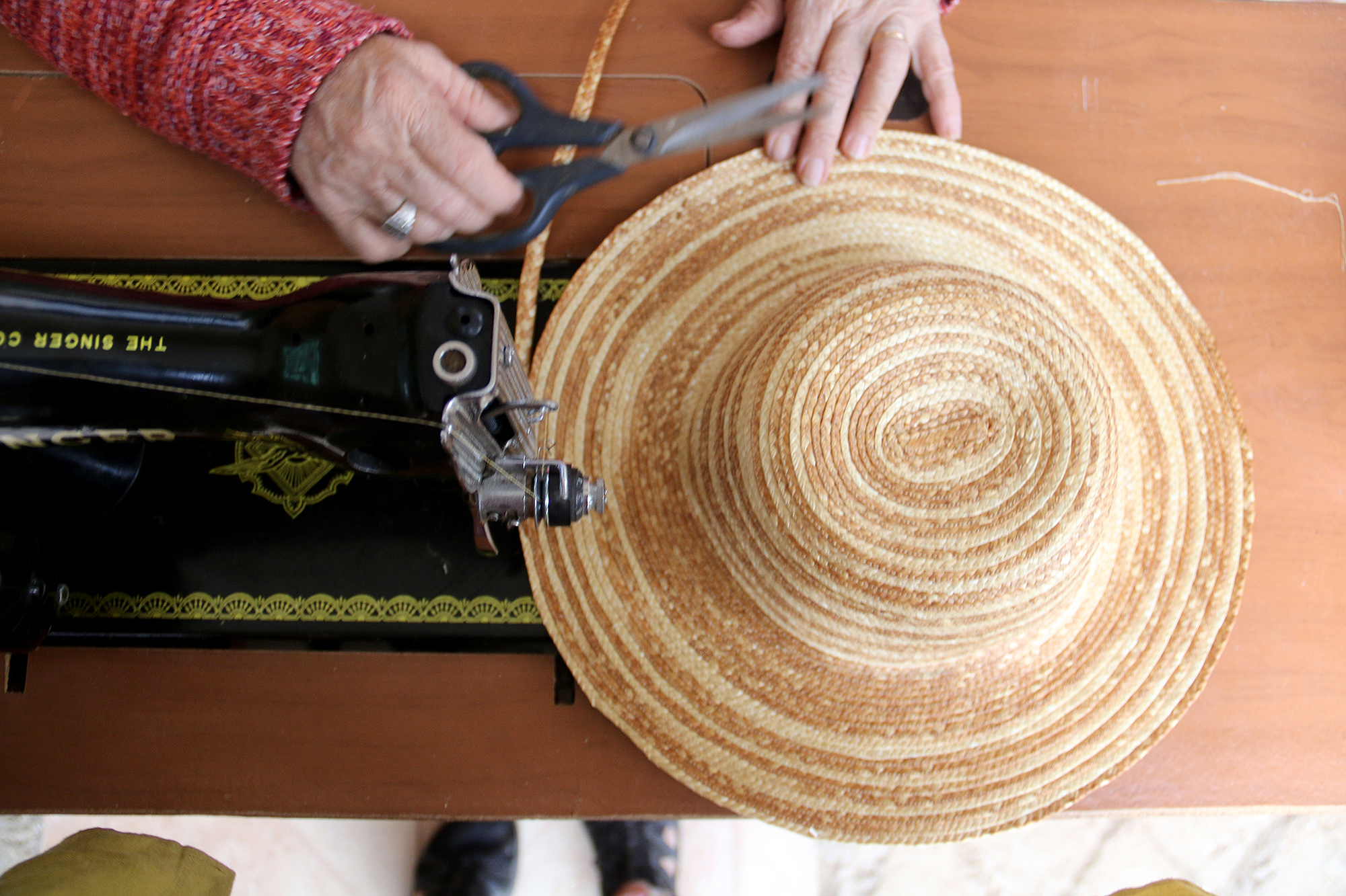 Lo que destaca en el uso de las máquinas de coser para la confección de sombreros es la ausencia de un cabezal que sobresalga, lo que permite dar forma al sombrero sin que la copa se vea obstaculizada por este.