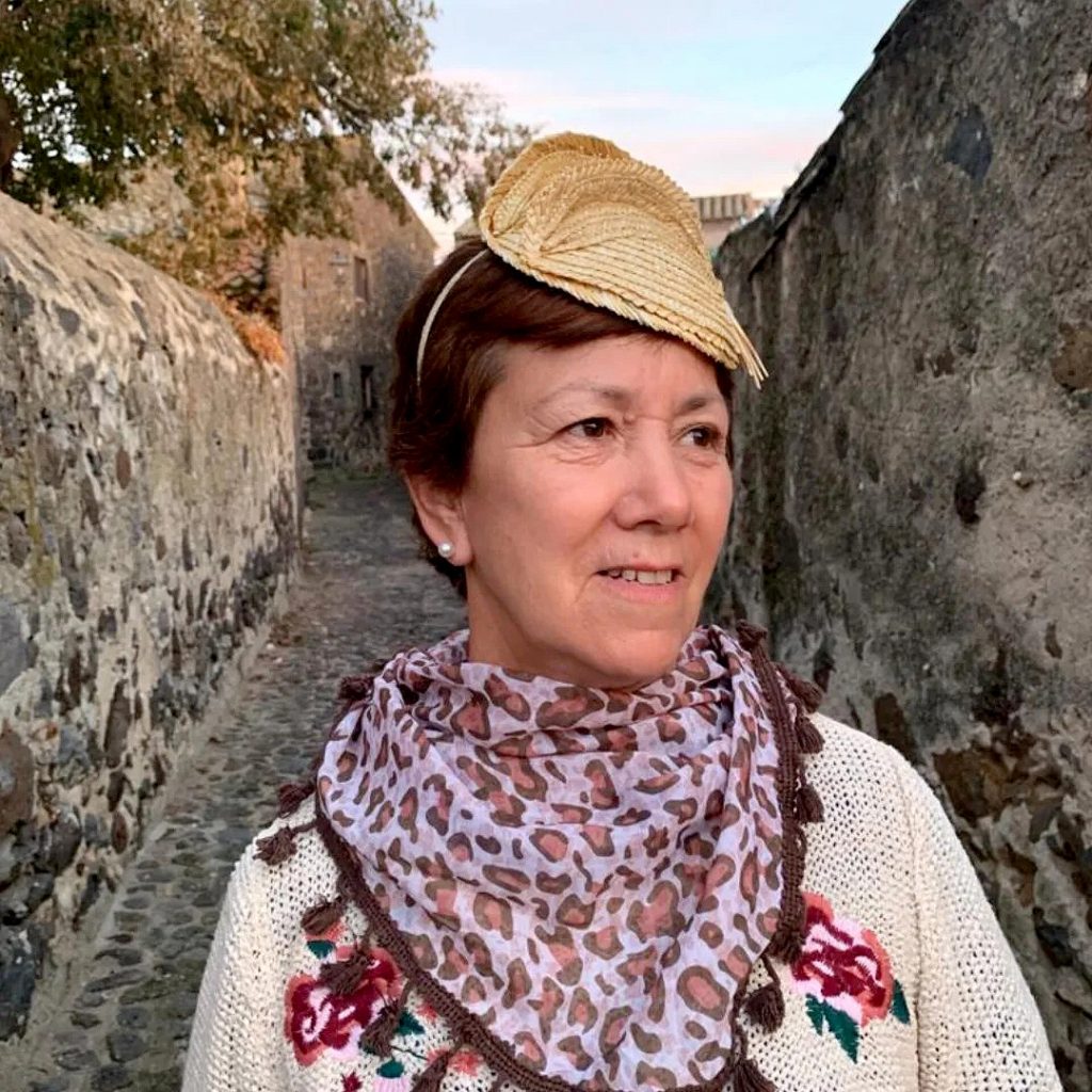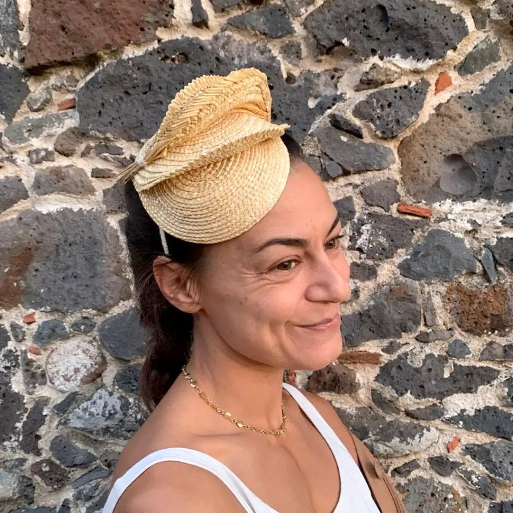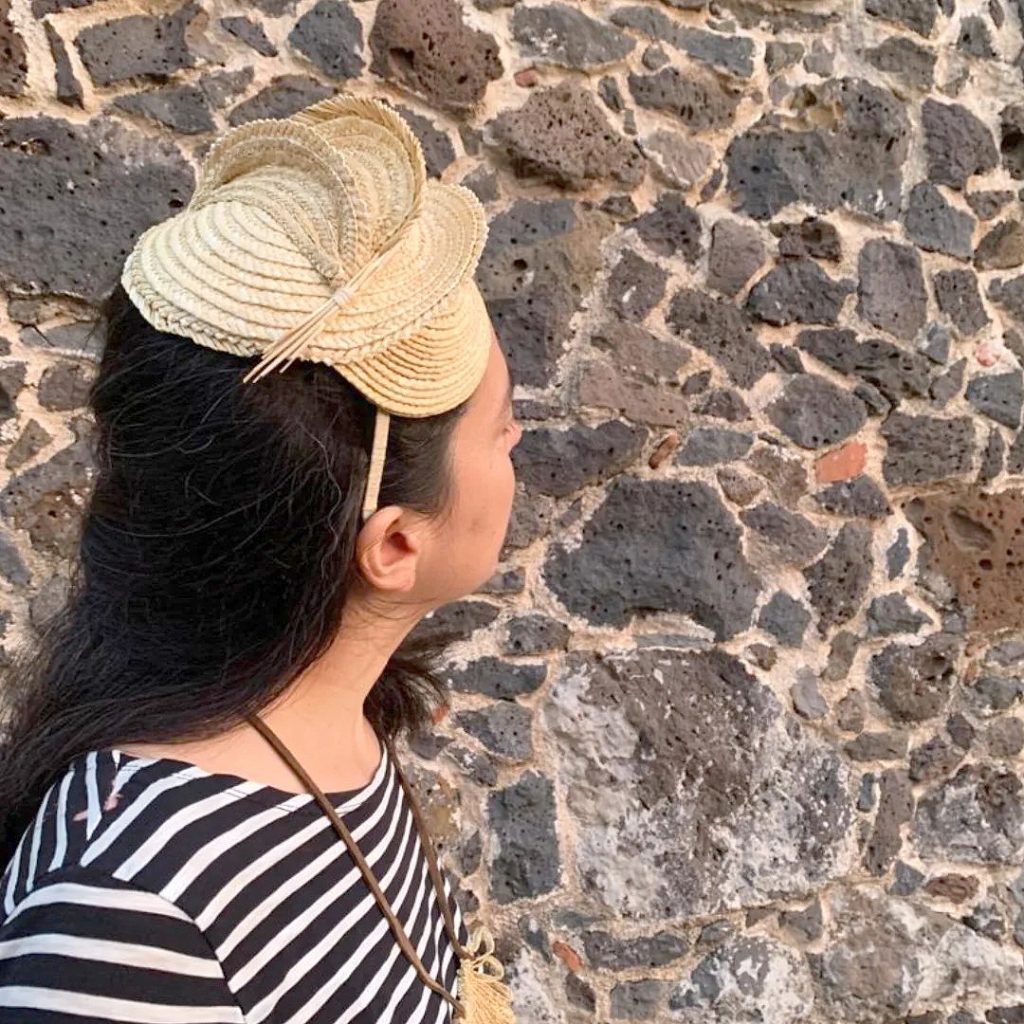 El tocado «Trigu» recoge trenzas de puntos antiguos hechas en Florencia, tesoritos de Francesca, que muy habilmente Juana Muñoz reprodujo en paja de trigo Ligún.